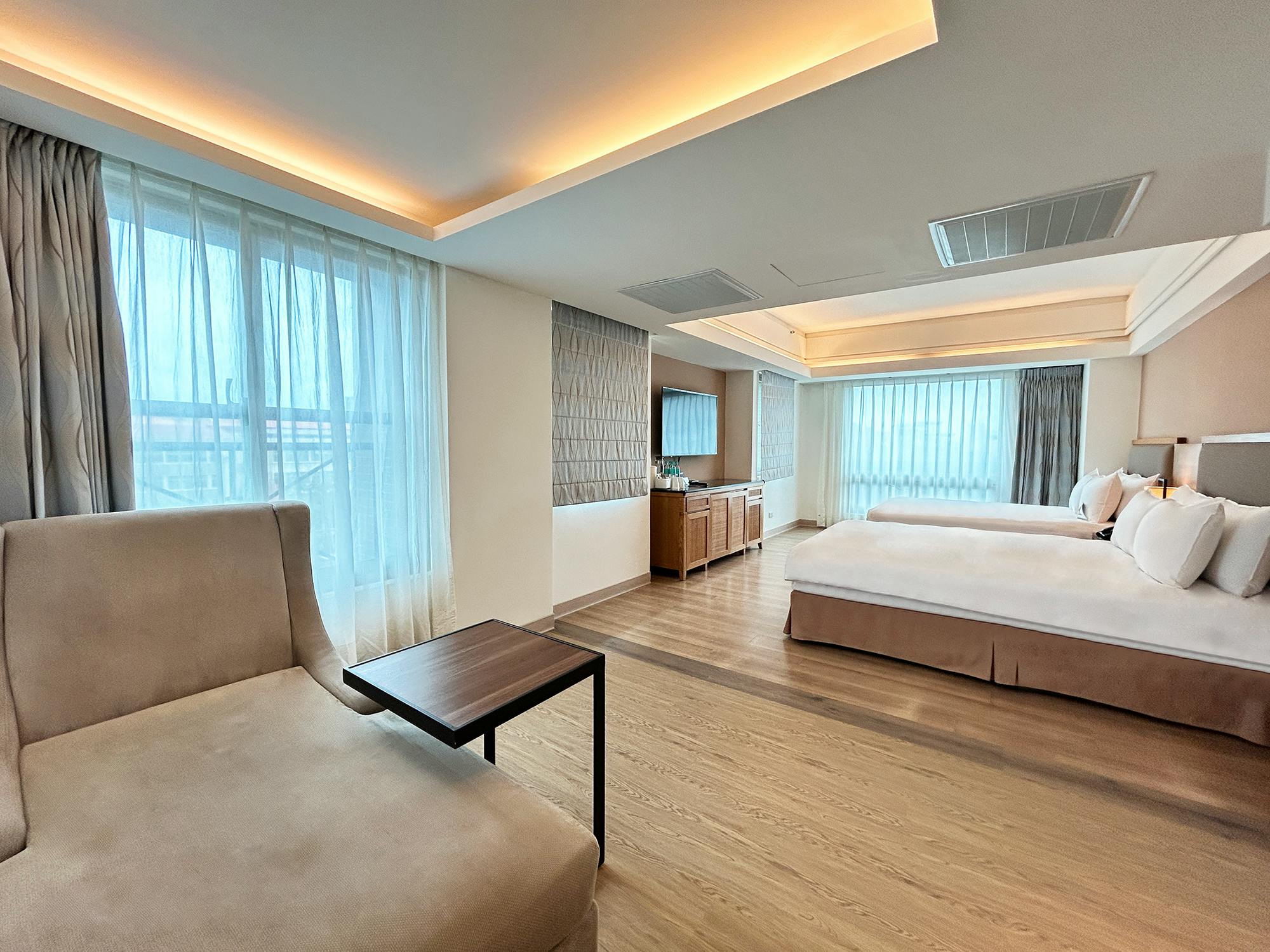 The room is adorned with warm tones and soft lighting, creating a cozy and comfortable atmosphere.