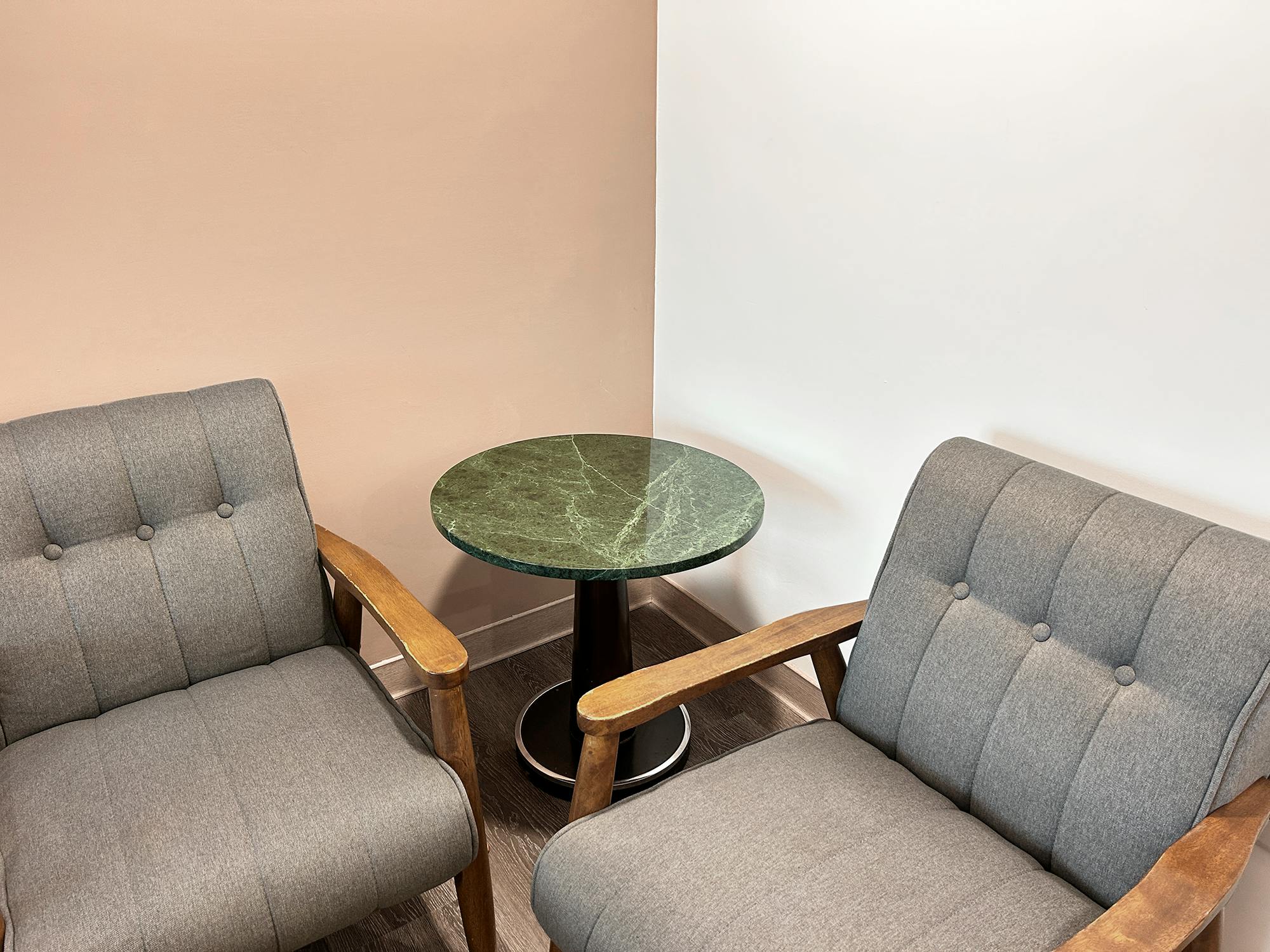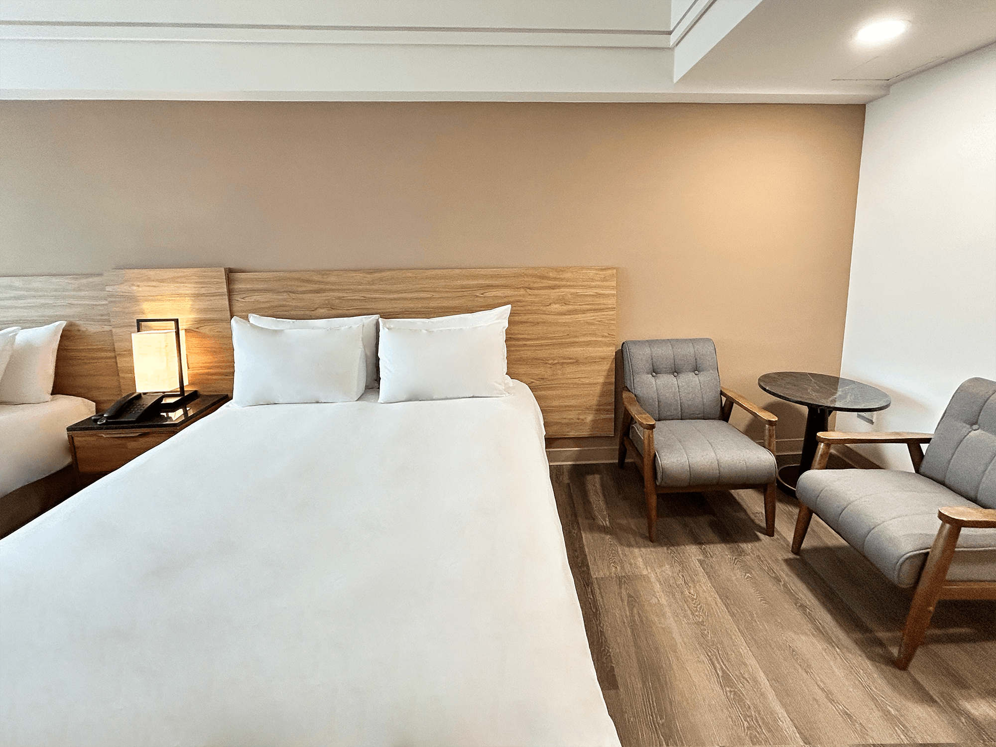 The room is adorned with warm tones and soft lighting, creating a cozy and comfortable atmosphere.