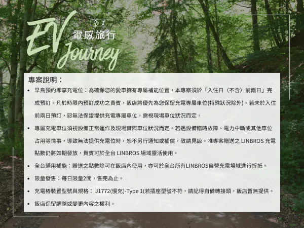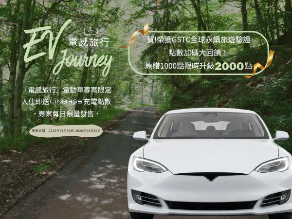 專為電動車主量身打造專屬禮遇:享受「下樓即補能」的極致便利,預定該專案入住再贈 LINBROS 充電點數,陪您續航下一段精彩!